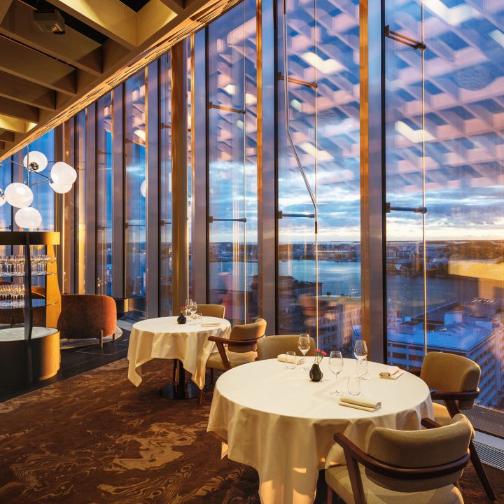 14. kerroksen moderni tila, kuusimetriset ikkunat ja näkymä merelle tekevät illallisesta elämyksen jo ennen ensimmäistä suupalaa.